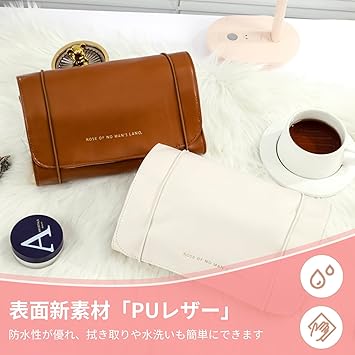 ・【防水素材】表面は革素材、手触りが快適で、防水性があり汚れに強く、一拭きですっきりと綺麗になります。内側にはPVC素材の防水ポーチが2つ付いており、化粧水や濡らしたくないブラシやパフなどを保管し、袋の中を乾燥させ、漏れを防ぎます。通気性があり速乾性のあるメッシュポーチで、中の内容物が一目で分かります
