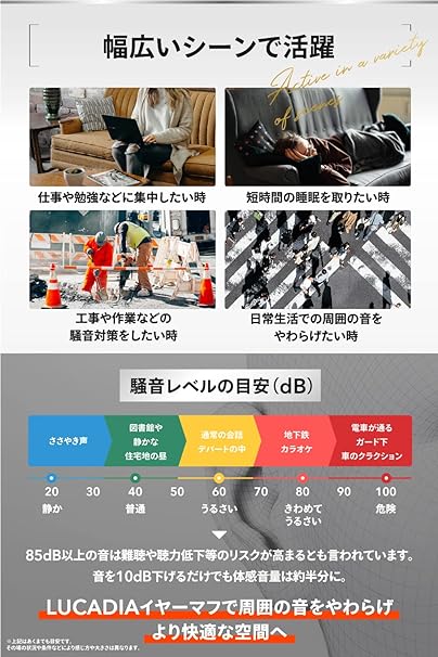 【 周囲の音をやわらげる遮音性×柔軟なフィット感 】 「ハイクオリティのイヤーマフを低コストで」をコンセプトに、コストパフォーマンスを追求したイヤーマフ『 LUCADIA(ルカディア) 』がついに登場。 周囲の音をやわらげる「高い遮音性」を持ちながらも、快適に装着できるように「柔軟なフィット感」も追求。また、優れた機能性だけでなく、ファッション性も追求したスタイリッシュなデザイナーズ設計となっています。