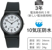 シンプルで見やすい文字板と10気圧の防水性を備えた、普段使いに最適なスタンダードな腕時計。ベルトは汚れに強く、耐久性に優れたポリウレタンを使用。ケースや風防には、樹脂やアクリルを使い軽くて丈夫な仕上がりになっています。34ミリと少し小さめなサイズなので、女性やお子様用としても最適です。