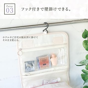 ・【こだわりポイント】フック付きで吊るすだけで、すぐに使いたい物が取り出せる!面倒な荷ほどきから解放されます!また、吊るすだけなので、場所を取ることなくご使用いただけます。ドレッサーや洗面台に吊り下げたまま使用OK!さらに、小さなポケットがたくさん付いているので、細かいものたくさん収納できちゃいます♪