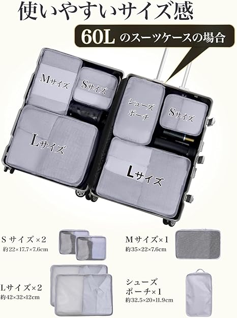 ・【商品詳細】トラベルポーチ(旅行用ポーチ) 6点セット サイズ:S(約22×17.7×7.6㎝)、M(約35×22×7.6㎝)、L(42×32×12㎝)、シューズケース(約32.5×20×11.9㎝) 素材:プラスチックシート+紡織用繊維製 【30日間の返品保証制度】HOME COCCIではご購入いただいた商品でご不明点などがございましたら柔軟にご対応いたします。ご購入後30日以内であれば、返品保証を適用させていただきます。本製品は日本国内で企画されており、日本語でのお客様サポートをさせていただきます。