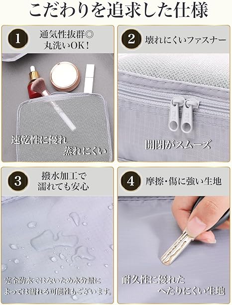 ・【メッシュ生地で通気性抜群】メッシュ生地のトラベルポーチで中身が分かりやすく、湿気がこもりにくい。丸洗い可能で速乾性にも優れます。【撥水加工で安心】少量の水であれば、撥水するので衣類が汚れる心配も少ない!【摩擦に強い耐久生地】へたりにくい素材で、摩擦や刺激にも強い。