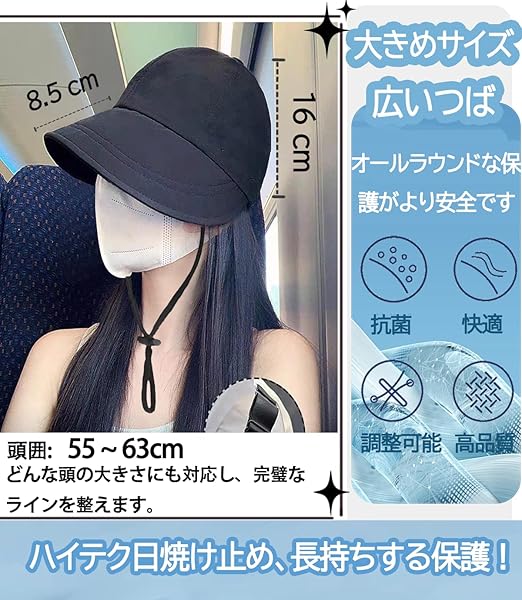 ・2、【広いつばと大きめの頭囲】 広いつばと拡大された頭囲のデザインがこの日焼け止め帽子のハイライトです。広いつばは暑い日差しを効果的に遮断し、顔と首を包括的に日焼けから守ります。同時に、この帽子は大きいサイズなので、小さな頭でもふっくらとした頭でも、制限感なく簡単にかぶることができます。もちろん、このデザインは日焼け止め効果を高め、太陽を効果的にブロックするだけでなく、顔の形を修正し、着用者をより小柄でキュートにします。