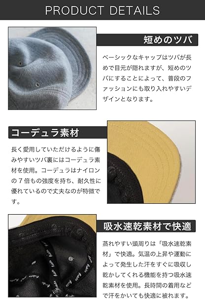 ・【長く愛用していただけるように】傷みやすいツバ裏にはコーデュラ素材を使用。コーデュラはナイロンの7倍もの強度を持ち、耐久性に優れているので丈夫なのが特徴です。また、蒸れやすい頭周りは「吸水速乾素材」で快適。気温の上昇や運動によって発生した汗をすぐに吸収し、乾かしてくれる機能を持つ吸水速乾素材を使用しています。長時間の着用などで汗をかいても快適に被れます。