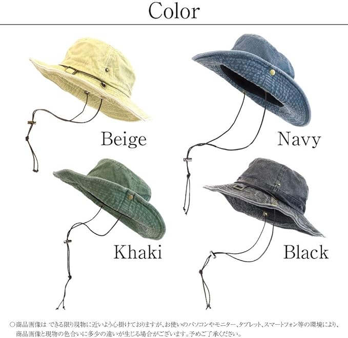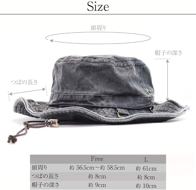 ・サイズ:フリーサイズ(頭周り 約56.5cm~約58.5cm/つばの長さ 約8cm/帽子の深さ 約9cm)、Lサイズ(頭周り 約61cm/つばの長さ 約8cm/帽子の深さ 約10cm)