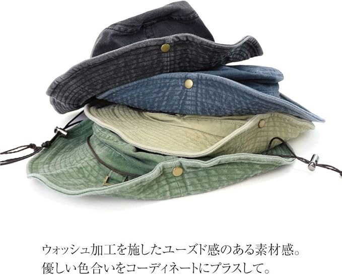 ・オーソドックスなスタイルが人気のアドベンチャーハットです。ウォッシュ加工された表面生地で新品でもユーズド感が楽しめる風合いとなってます。帽子の両サイドにはスナップボタンが付いており、留めることでテンガロンハット風にスタイルチェンジできます。