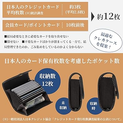 ・【日本人のカード保有枚数を考慮したポケット数】統計調査(※)では日本人のクレジットカード平均2.8枚と約3枚です。さらに会員カード、ポイントカードを足すと、10枚前後になり、実は普段使用するカードは決して多くはありません。本商品の多くも、反対に少なくもない12個のカードポケットは、本当に必要なカードだけを大切に収納するのに最適な収納数です。カードが入りすぎるが故に、「結局必要なときに必要なカードを取り出せない」「探せない」「不要なカードばかりが溜まってくる一方で、結局整理できたのか、ごみ集めをしているのかよく分からない」といった心配もありません。収納枚数12枚は日本人の平均カード保有枚数を考慮した最適なカードポケットです。 (※)一般社団法人日本クレジット協会「クレジットカード発行枚数調査結果の公表について」