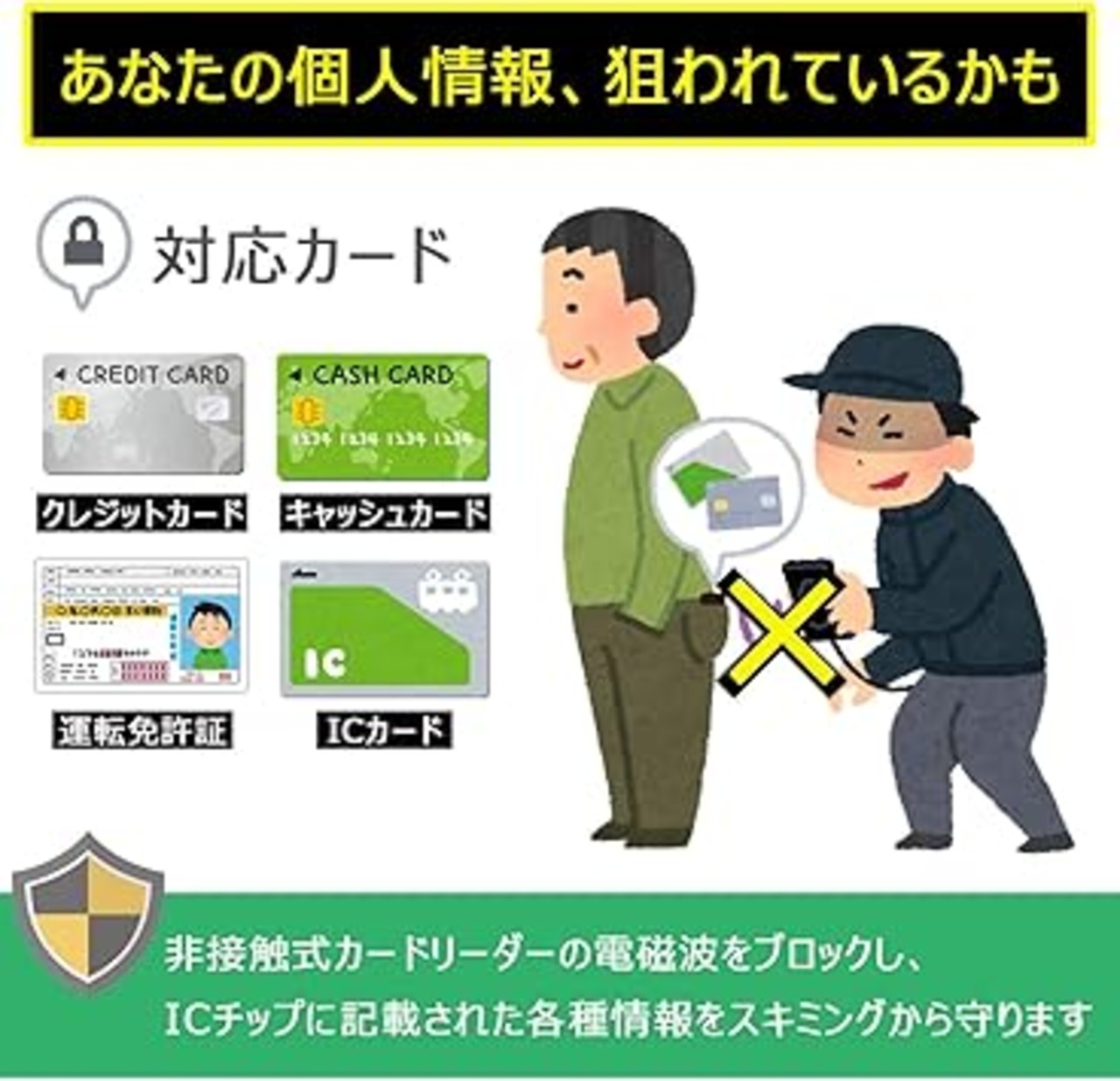 ・『最新スキミング手口』 電子マネーの浸透に伴い非接触式スキミングの被害が増大。端末にかざすだけで支払いが完了する非接触決済(コンタクトレス決済)に使われるカードを、非接触型カード(例:Suica、ICOCA、PASMO、PiTaPa、楽天Edy、nanaco、ICチップ型クレジットカード、etc.)と呼びます。カードがカバンの中に入っていても、無線式スキマーをカバンに近づけるだけで情報が読み取られてしまう危険性があります。防止策を自ら考えるためにも、不正利用の最新手口を詳しく理解することがとても大切です。
