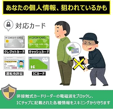 ・『スキミング防止機能』 スキミング防止シートを内蔵しているので、不正アクセスからあなたの大切な個人情報や財務データを守ります。日常では満員電車やエレベータの中など(人が密集した場所)、海外旅行中でも街中で被害にあう可能性があります。電子マネーの浸透に伴い、現金以外のキャッシュレス決済が身近に活用されて利便性が高まった日本だからこそ、隠れたリスクに応じたスキミング防止対策は非常に重要になります。