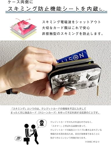 ・【 スキミング 防止 大切 な カード を 守る 】 カードケース の 両側 に RFID スキミング 防止 素材 を 採用 。 近年増加している スキミング被害 から 大切 な カード を 守ります。 ※ ICカード も 収納可能 ! ICカード は ファスナー を 開けて カード を 少し 出していただくと 改札機 に 反応 します。
