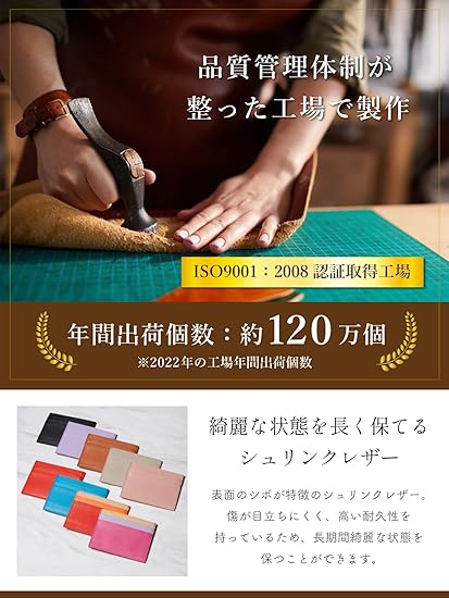 ・【綺麗な状態を長く保てるシュリンクレザー】表面のシボ目が特徴のシュリンクレザー。傷が目立ちにくく、高い耐久性を持っているため、長期間綺麗な状態を保つことができます。【品質管理体制が整った工場で製作】ISO9001:2008認証取得工場◆年間出荷個数:約120万個(2022年の工場年間出荷個数)◆熟練の革職人が丁寧に作り上げています。
