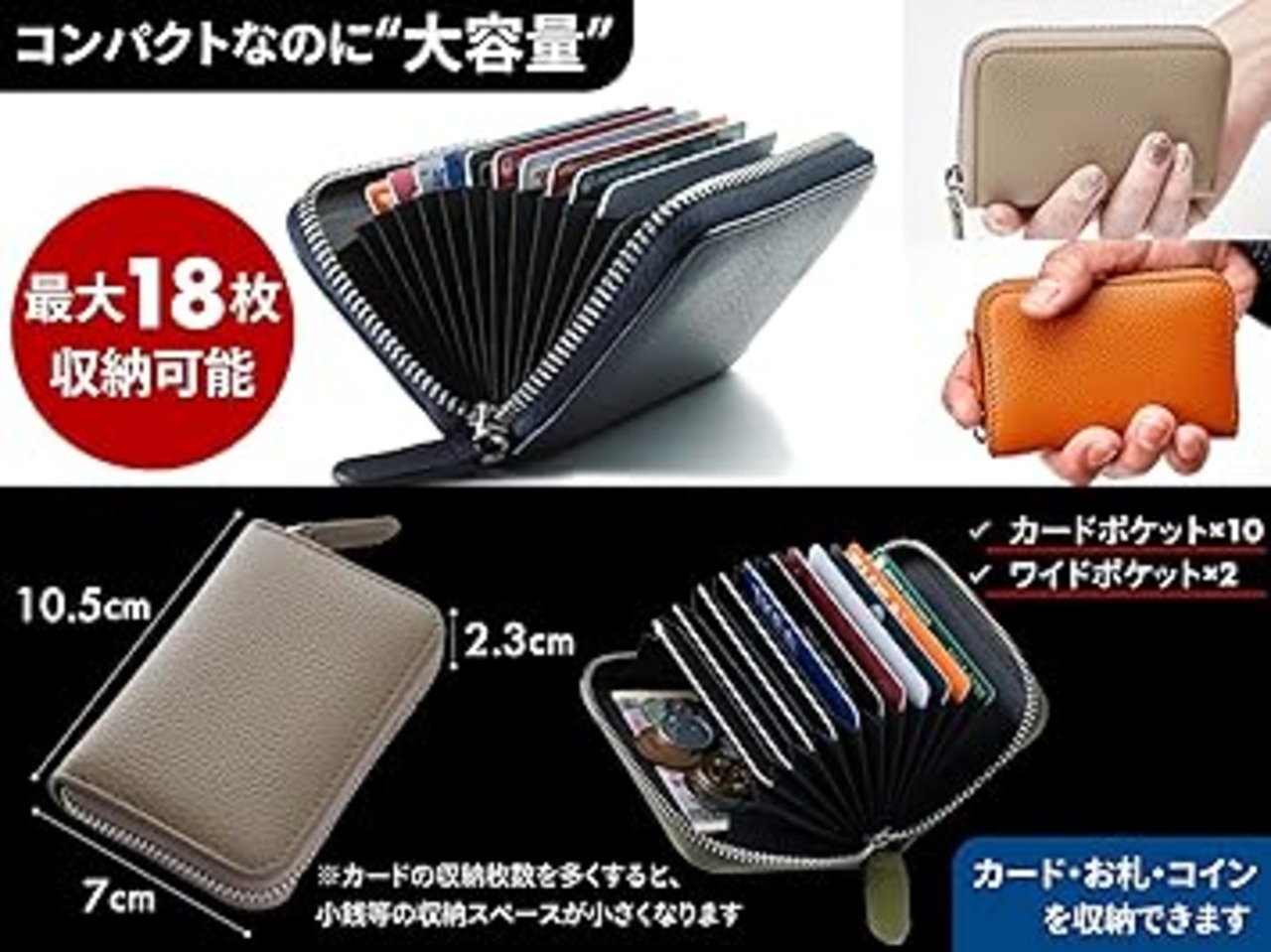 ・【スペック】サイズ:7cm×10.5cm×2.3cm、重量:84g、素材:牛本革、ポケット:12、スキミング防止シート内蔵(スキミング防止シート内蔵の為、ポケットに入れた状態でのSUICAやPASMOといった交通系ICカードの使用はできません。) 、YKKファスナー使用