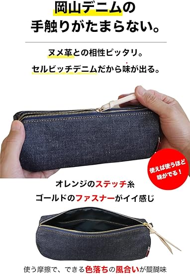 ・【マルチポーチ 小物入れ ペンケース 化粧ポーチ】外装素材が岡山デニムのセルビッチデニムで手触りがたまらない。安っぽいモノは嫌!というあなたにピッタリ見られて恥ずかしくないオシャレ大人に似合うポーチ。常に触るアイテム「ポーチ」は、通常、汚れて使用感がすごくなる。しかし、当商品に採用する岡山デニムは、使うごとに出る使用感もスレて経年変化の味わいがでる。ファスナーの持ち手には、ヌメ革を使いこちらも使うたびエイジングでイイ感じの飴色に経年変化する。ファスナーのゴールドとステッチ糸のオレンジがデニム好きにはたまらない。多少の嵩張る小物も入る旅行にもおすすめの大容量マルチポーチ。