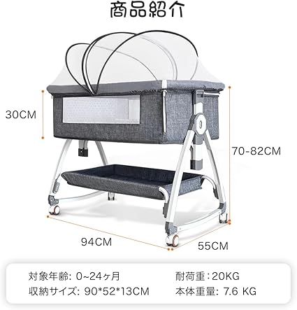 ・【商品紹介】対象年齢:新生児0~24ヶ月 材質: 高炭素鋼+綿 重量:7.6kg 耐荷重:20kg 展開サイズ:94×55×82cm 収納:90×52×13cm ベビーベッドセット内容:本体、マット、蚊帳、収納バスケット、収納袋。