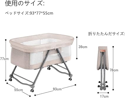 ・「多機能」①揺籃に変身可能。②大容量な収納かごつき、小物収納便利。③キャスターとブレーキ付き、移動便利。④四段階高さ調節可能。⑤カバーを外して洗濯可能。➅ベッドは少し傾き、新生児に対してミルクの吐くことを防ぐことができます。