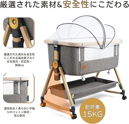 ・【消音キャスター・取り外せる蚊帳】騒音なしキャスター付きでどこにも移動が楽々です。また、取り外せる蚊帳を搭載、赤ちゃんの快適な眠りを守ります;周りのベッドフェンスは透明的なメッシュから、赤ちゃんの様子を側から確認可能です。