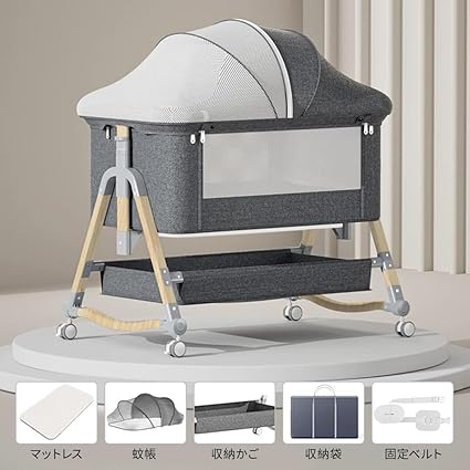 ・【高さ調節可能・ゆりかごに変身可能】高さ6段階調節可能で、各高度の大人ベッドにくっつけてご利用可能です。ーベッドは斜めの調節可能で、新生児に対してミルクの吐くことを防ぐことができます。三角形の構造+ 4点ポジショニングサポートはピラミッドと同じくらい安定しています。固定ベルト付き、大人ベッドから離れを防ぐ、くっつける可能、更に安定、安心。揺りかご機能付き、10度のわずかな揺れで赤ちゃんはすぐに眠りにおちます。