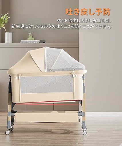 ・【高さ調節可能・ゆりかごに変身可能】高さ6段階調節可能で、各高度の大人ベッドにくっつけてご利用可能です。ーベッドは斜めの調節可能で、新生児に対してミルクの吐くことを防ぐことができます。三角形の構造+ 4点ポジショニングサポートはピラミッドと同じくらい安定しています。固定ベルト付き、大人ベッドから離れを防ぐ、くっつける可能、更に安定、安心。揺りかご機能付き、10度のわずかな揺れで赤ちゃんはすぐに眠りにおちます。