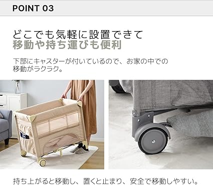 ◆ 01お部屋に馴染むオシャレなデザイン どんなお部屋にも馴染みやすいナチュラルなカラーがオシャレ,インテリア性の高いデザインにこだわりました。大きくなったらプレイヤードとしてマットを下段に取り付けると、プレイヤードになります。 ◆ 02収納に便利 たたみ方は簡単床面の中央にあるバンドをつまみ、引っ張りあげながら畳んで、収納袋に入れるこんなにコンパクト,使わない時はらくにたたんで収納できます。収納時はマットを取り出してから、たたんでください。詳しいたたみ方については取扱説明書をご参照ください。 ◆ 03どこでも気軽に設置できて 移動や持ち運びも便利下部にキャスターが付いているので、お家の中での移動がラクラク持ち上がると移動し、置くと止まり、安全で移動しやすい ◆ 04収納スペース満点 側面バック付き背面バック付き赤ちゃんのおもちゃ、おむつ、日用品などを収納できます。 ◆ 05簡単組み立 ツールは不要で、3分であっさりと組み立て完了。お昼寝シートはファスナーで取り外し可能、さらにプレイヤードモードに簡単チェンジ。赤ちゃんの安全を守るために、後退防止の特別ファスナーを採用していますので、ファスナーをあげる時は真っすぐではなく、すこし上がってあげてください。