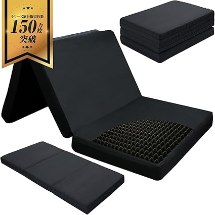 ・【サイズ】シングル/約95x195x10cm【仕様】三つ折極厚タイプ【硬さ】程よい硬さの150N【カラー】ブラック【素材】中材:特殊凹凸カッティング竹炭配合高反発ウレタンフォーム、カバー:伸びにくい布帛生地