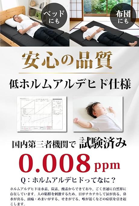 ・【極とは】 【極】高反発マットレスは、硬すぎず柔らかすぎない絶妙な硬さで、どんな寝姿勢にもフィットし、一晩中快適な睡眠を提供します。極厚10cmのウレタン素材が、体をしっかりと支えながらも、ふんわりとした寝心地を実現。三つ折り式で収納も簡単で、使わない時はコンパクトに折りたためるため、スペースを有効活用できます。