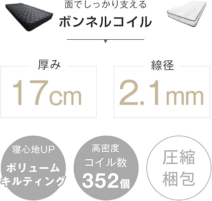 タンスのゲン マットレス シングル 厚み17cm 高密度 352個 ボンネルコイル 硬め ベッドマット 通気性 ブラック 17800009(