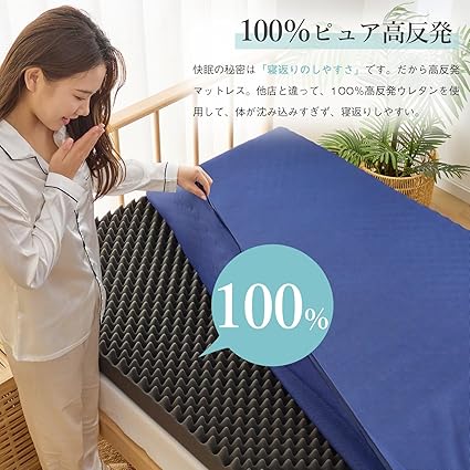 ・【高反発素材】圧縮梱包で届いています。開封後、風通しの良いところで3-7日間置いて、回復できます。マットレスが元の形に復元しにくい場合は、手で軽く叩いて、或いはドライヤーで温めていると復元時間が短縮できます。マットレスは高反発素材を採用しており、優れた復元性とクッション性を兼ね備えています。密度25Dで、ぐっと押しても、すぐに戻る高反発マットレスです。全身をバンランスよく支え、過度の沈み込みのない快適な寝姿勢を作り出します。10㎝厚みがあるからベットにそのまま使用できます。床敷でも畳でも使えます。210Nの程よい硬さで、しっかり体を支えています。復元率98%で、長期間使用していても形崩れにくく、長く愛用できます。
