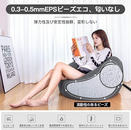 ・【自由にスタイルを作り、ゆったりと寛ぎます】:ビーズクッションはエコで健康的な直径0.3-0.5mmのEPSビーズで充填されています。極小のビーズは流動性と弾力性があります。座ると背中をしっかりと支え、体にピッタリフィットします。体をリラックスさせ、疲労を和らげることができます! 本を読んだり、テレビを見たり、パソコンで勤務したり、スマートフォンを弄ったり、寝転がったり、好きなように使えます。