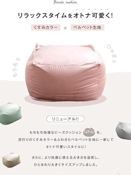 タンスのゲン ビーズクッション 日本製 60×60×36cm くすみカラー ベルベット生地 洗える カバー付 Mサイズ 特大 4403020