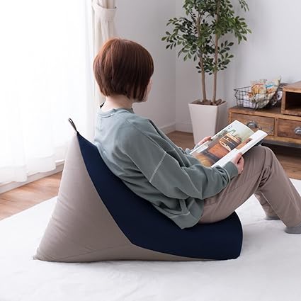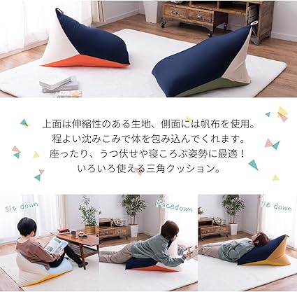 ・うつぶせになったり、座ったり、寝転んだり。生活のルーティンにこれ一個!いろいろ使える三角クッションです。上面は伸縮生地、側面は帆布を使用し、異なる触り心地をお楽しみいただけます。中には、細かい発砲ビーズをたっぷり入れています。程よい沈みこみで体を包み込みます。細長い形状なので、座るだけでなく、うつ伏せや寝転ぶ姿勢にも最適です。