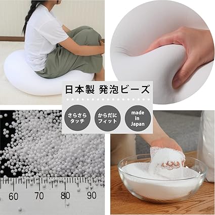 ・中材 極小ポリスチレン発泡ビーズ ビーズは日本製原料を使用しています。優れた流動性で身体にフィットします。ビーズのきしむ音がしにくく、臭いが少ないです。 岡山の自社工場で発泡して中詰めしています。 発泡したビーズの大きさ/粒径は 約2ミリです。