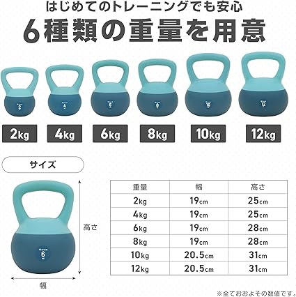 ・【幅広いバリエーション】2kgから12kgまで6種類の重量をご用意しました。はじめてのエクササイズから本格的なトレーニングまで、様々なニーズに合わせてお選びいただけます