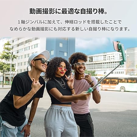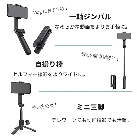 30cm伸びる伸縮ポールや、着脱式のワイヤレスリモコンなど、ジンバルとしても自撮り棒としても、スマホ三脚としても使える機能が満載です。