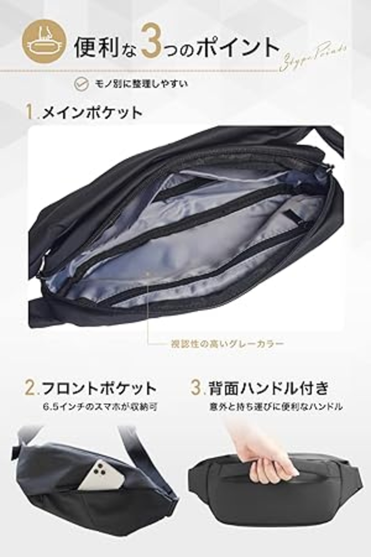 ・【他とは違うマット感のある撥水素材】:サラサラした手触りで身体への負担も少なく、突然の雨にも安心な撥水オックスフォード素材を採用。 ベルトはサイズ調整自由に可能、持ちやすい取手付き【Details】:サイズ:36cm×14cm×8cm、重さ:280g、ベルト長さ:60cm-最大100cm、素材=撥水オックスフォード、裏面は独自の蒸れにくい”エアースルーメッシュ素材”を使用。【安心の30日返金保証付き】:インターネット通販でのファッションアイテムのお買い物ですので、「いざ着用したらイメージと違わないだろうか..」「サイズや素材は実際に手をふれて確かめないので不安を感じる」というお声をよく頂戴いたします。そのような購入前のご不安を当店では少しでも解消して頂きたいという思いから、到着後30日以内でしたら、上記のような理由などでも、無条件で開封済みでも 全額返金・返品保証サービスを付帯。