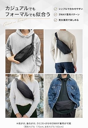 ・【機能的でもオジサンくさいのはイヤだ..】というお客様の声に応えたボディバッグ:意外とボディバッグに関しては、「おじさんくさい」「一昔前のデザイン」と思われるボディバッグが多かったりと、選び方が少し難しい部分もあるボディバッグ。時代や流行に左右されず、洗練されて、誰でも着けるだけで高見えするデザインを追い求めました。ユニセックスデザインのため、男性用 女性用 どちらも似合うデザイン。キッズや学生から 20代 30代 40代 50代ギフトやプレゼント用にも。また普段使いから海外旅行、ジム、ウォーキング、お散歩など幅広いシーンでも使えます。