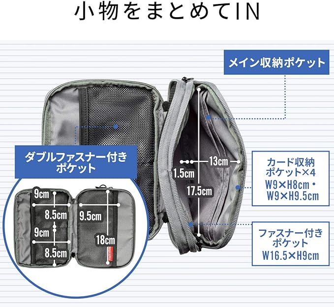 ・ポーチの前面にはファスナー付きポケットがあり、SDカードやUSBメモリーなどの小物類を収納できます。ガジェット類だけでなく、貴重品を入れて機内持ち込み用のポーチとしてや出張や旅行など様々なシーンで活用できます。