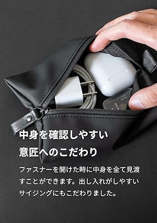 ・デジタルにこそ、最高の耐水性能を。充電用のケーブルなど、デジタル周辺機器にとって水濡れは厳禁。メイン素材からファスナーまで耐水素材にこだわり、見た目もシンプルに仕上げました。