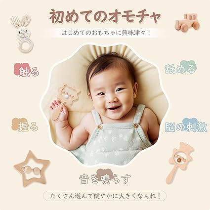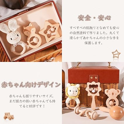 ・【赤ちゃん向けのデザイン】赤ちゃんの初めてのおもちゃとしてお使いいただけるラトルです。動物や月などの形が可愛らしいおもちゃです。ラトル、手押し車、ひも通しおもちゃなど。お子さまが興味を持って遊び、成長するためのおもちゃを豊富に取り揃えています。赤ちゃんが握りやすく、遊びやすいサイズに特別に設計されています。外出先にも持って行きやすく、負担になりません。