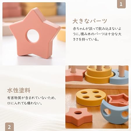 ・【多目的知育玩具】1歳~6歳また以上の年齢に合わせる多機能なおもちゃです。棒通し・形合わせ・型はめの遊び、想像力を育てるごっこ遊び、ゲームや数字の認識など遊びは様々。遊んでいるうちに、大きさの違いや色の認識、自然の感覚、配色などが理解できるようになってきます。