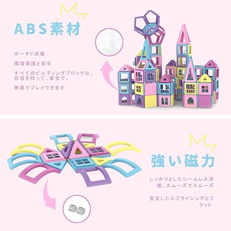 ・【日本食品検査済・安全・安心・マグネット玩具】 CE承認、EN-71,ASTM,認定済みマグネット おもちゃ。玩具安全基準合格製品です。本磁気ブロックおもちゃは日本製高品質のABS素材+天然磁石で作られており、ラスチック各辺の中央には強磁性のマグネットが内蔵されていますので、水洗いも可能で、長時間経っても、磁力が弱くなりなく、有害物も発散しない知育おもちゃ マグネット ブロックです。