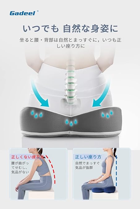 ・【新型座ぶとん・美しいシルエットへ】 新型なクッションは自然な生理学アークに基づいて設計し、脊椎のSカーブを常に維持します。独特なデザインを採用し、座る時に体の重心を自然に後ろへ移動します。脊椎は自然にまっすぐで、適切にアライメントを促進します。そしてクッションは自然に凹み、お尻をしっかりフィットして、自然なカーブを守ります。座るだけで自然に前傾する姿勢を保ち、背筋が自然に伸びるので、長時間に使用したら、お尻がもっと上がり、美しくなります。(※ご注意:本製品は正しい座り方を補助する役割しか果たしませんか、座りの姿勢を矯正することはできません。)