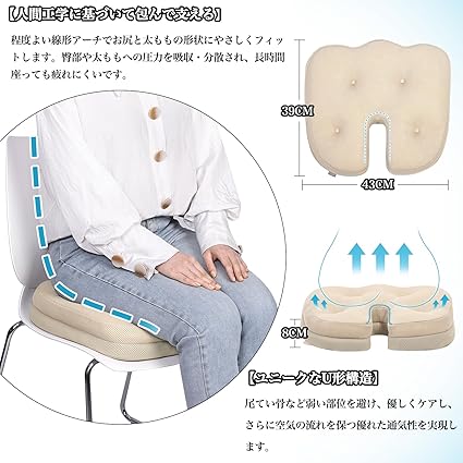 ・【腰痛対策】ユニークなU形構造で尾てい骨など弱い部位を避け、優しくケアし、長時間座っていても疲れにくい。さらに空気の流れを保つ優れた通気性を実現します