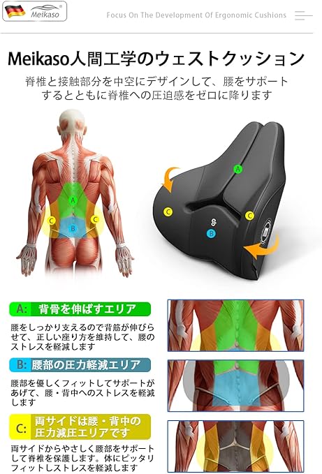 ・【創り上げる理想的な美姿勢】Meikasoは累計販売データと数年間の繰り返しのテストによりモダンファッションと購買ニーズが合う腰クッションをデザインしました。採用したドイツ輸入のメモリーコットンは体のカーブとぴったりフィットできて、シートと背中の隙間を埋めて、腰部の両サイドから包み込んでサポートして、それとなく正しい姿勢に導いてくれます。