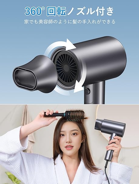 ・【3倍超強風&60S速乾】ドライヤー 最高回転数110,000rpmの高速ブラシレスモーターを搭載し、3倍の強力な風速を実現しています。髪の表面の水分を素早く除去し、乾燥時間を50%短縮できます。忙しい朝もさっと乾かして、すっきりとした気分で外出できます。