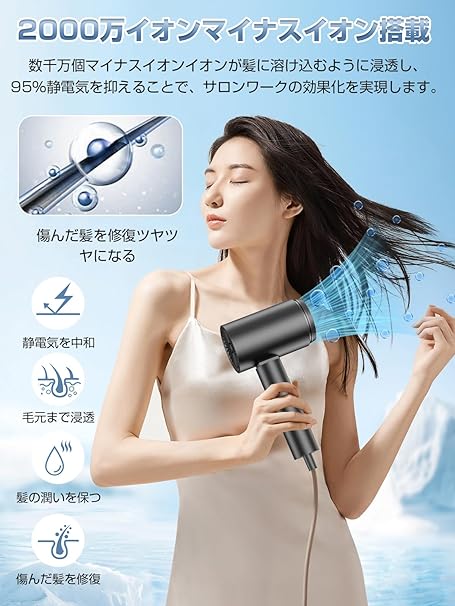 ・【髪に嬉しいマイナスイオン&乾かすたび、髪の内側まで水分補給】高濃度のマイナスイオン装置が内蔵され、豊富な2000万イオンが放出させ、静電気の発生を最大限に抑え、髪に潤いを与えながら、乾燥した髪を改善します。毎日のドライ時間も、ダメージ髪をいたわるケア時間に。(自社測定)