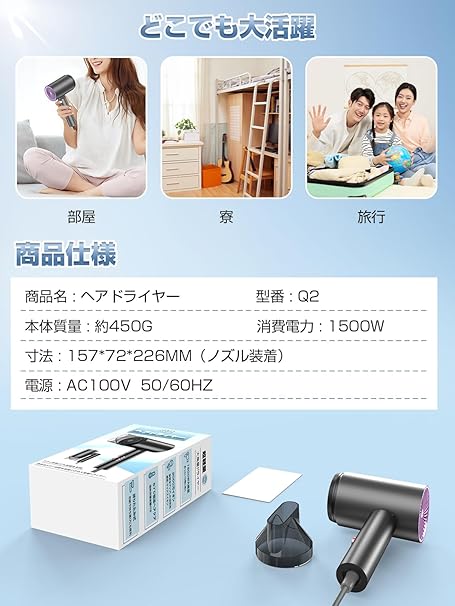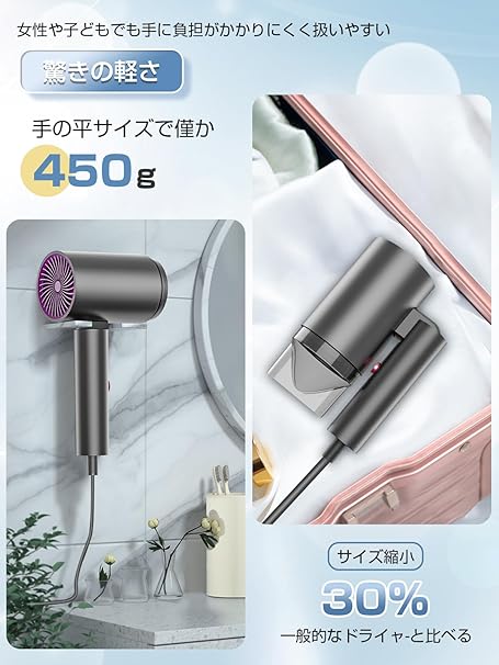 ・【折りたたみ式・持ち運びにも便利】ノズルを含めず450gとなり、毎日使いでも疲れにくく、らくらく使えます。折り畳み式デザインなので、普通のドライヤーよりコンパクトで、持ち運び便利です。自宅だけでなく、ビジネス、出張や旅行などにも大活躍します。