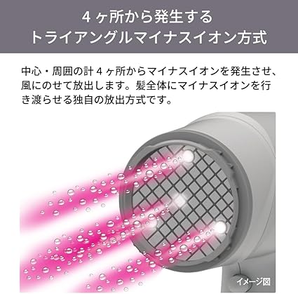 ・【モイスチャー】マイナスイオンと風を髪全体へ。広範囲に届けます。【ポイント】マイナスイオンと風を集中させる。髪の根元もしっかり乾かせます。※イメージ図