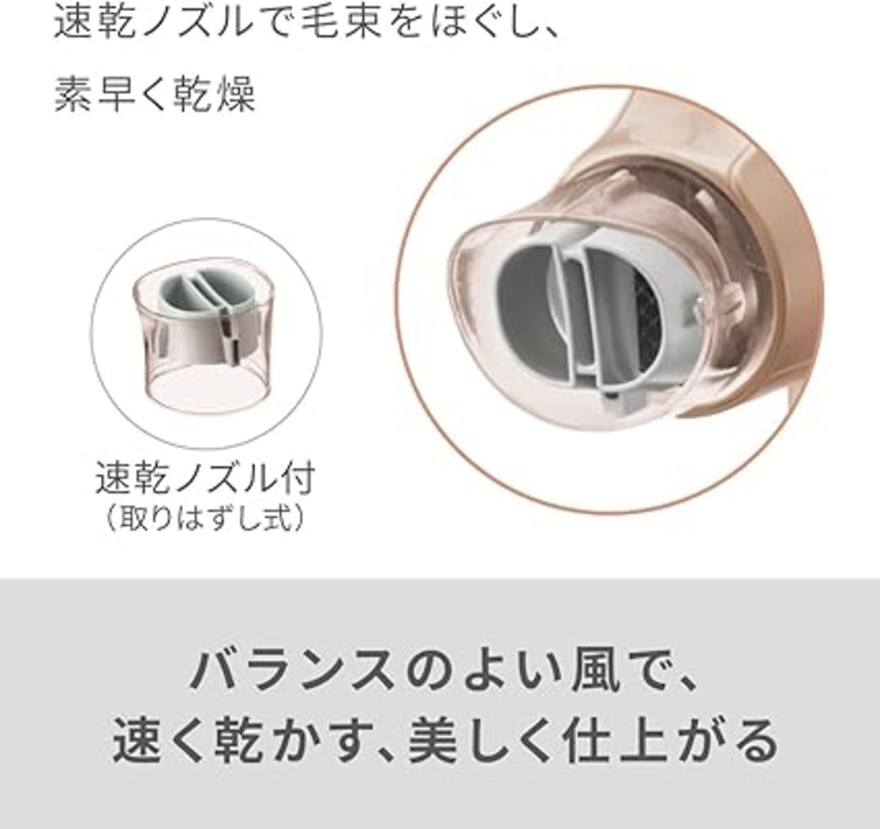 ・付属の速乾ノズルで毛束をほぐし、スピーディに乾燥。