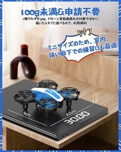 ・【360°全保護プロペラガード】360°全保護プロペラガードは、障害物に衝突した場合でも、家具や機体、プロペラを保護することができます。また、使用中にお子様の手を保護するので、保護者はお子様に安心して使用させることができます。【100g未満&ミニサイズ】機体はわずか30gで、軽量でありながら、ドローンの登録申請も必要ありません。到着後すぐに遊ぶことができ、非常に便利です。また、サイズも8.2×9×2.7cmの小型であり、家具の多くて狭いスペースや屋内での練習に適しており、収納スペースも取りません。