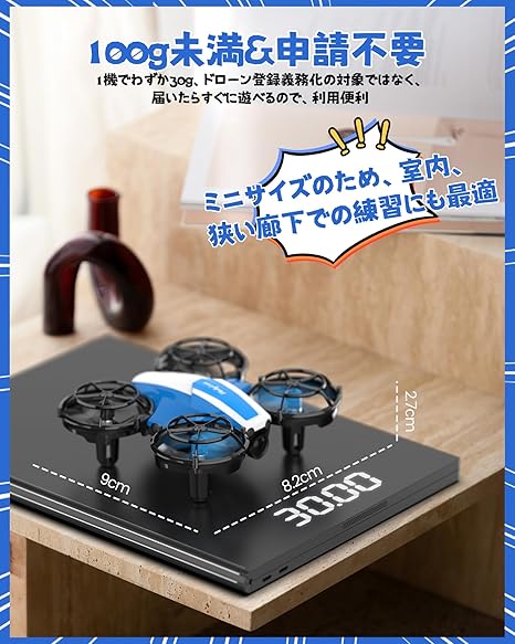 ・【100g未満&ミニサイズ】機体はわずか30gで、軽量でありながら、ドローンの登録申請も必要ありません。到着後すぐに遊ぶことができ、非常に便利です。また、サイズも8.2×9×2.7cmの小型であり、家具の多くて狭いスペースや屋内での練習に適しており、収納スペースも取りません。